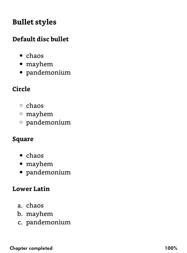 1. I just tried adding a word document with MS Word bullets added to Amazon kdp. Then i used the Amazon preview to view the bullets on different devices, And it looked perfect on All devices except for the kindle DX where the separation between bullet and text was a bit larger, but not bad. Does this mean that you can upload word formatted bullets on todays (2015) kindle devices? Or is it still a no-go for some reason? 2. If this is not acceptable, will I need to save the Word document as a HTML file and then add bullets like this and then upload HTML file to KDP? <.ul> <.li> item 1 <./li> <.li> item 2 <./li> <./ul> thank you very much for the help! |