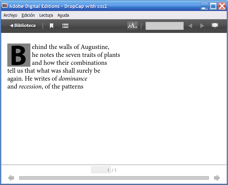 <h1>SVG Drop Cap for Kindle</h1> <p><span class="KDropSpace"><img alt="B" class="KSVGDropCap" src="../Images/B.svg" /></span><span class="NotKF8"><b>B</b></span>ehind the walls of Augustine,<br /> he notes the seven traits of plants<br /> and how their combinations<br /> tell us that what was shall surely be<br /> again. He writes of <i>dominance</i><br /> and <i>recession</i>, of the patterns</p> Below you can check the respective epub, with the SVG image for the letter "B". Regarding KF7, you know, we can't get there drop caps, so I displayed the first letter as bold. Regards Rubén Last edited by RbnJrg; 01-01-2016 at 06:25 AM. |