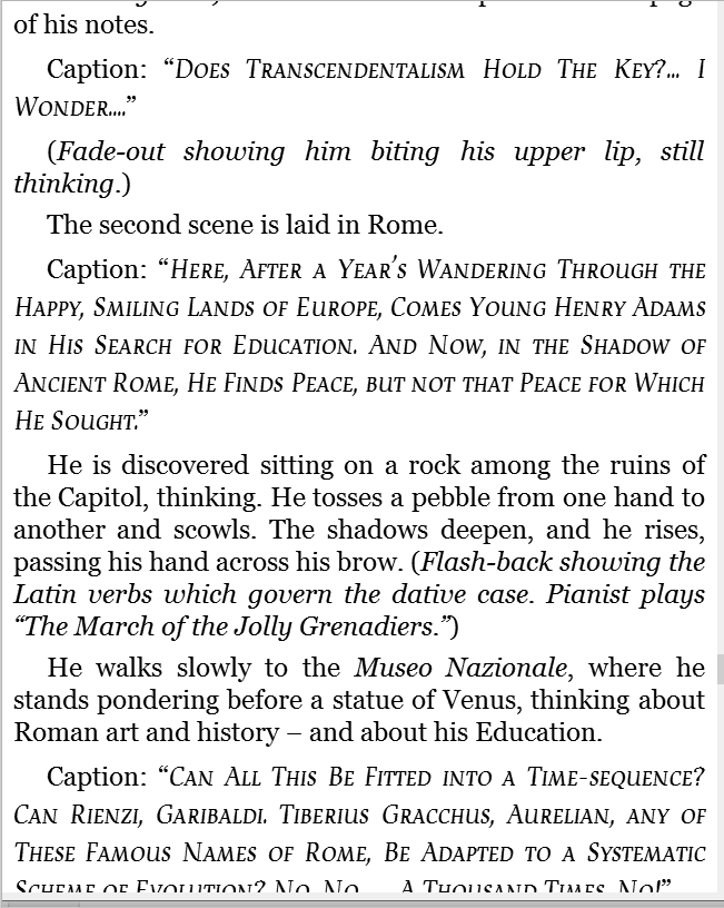 Often I have embedded small-caps fonts, to use for very short phrases, such as titles, signatures, etc. I have used semi-serif, such as Fontin or Marcellus, which *sort-of-kind-of-but-not-really* will go with the user's choice of serif or sans-serif body font. However, these books have entire sentences and paragraphs in small-caps. The embedded font does not look happy in such large swathes. I do not want to use fake small-caps with multiple spans for large and small font sizes (those multiple spans break search, and display fails on some readers). As you can see by the screen-shots of the p-books, small-caps are used for character names, and for "movie captions." Italics are already in extensive use for "stage directions" and other descriptions. So, should I replace the small-caps with ALL-caps? With BOLD? Or just ignore all that, and simply use normal text? In situations like this, I should probably ask myself, "What would Hitch do?" The answer floats back on the echoes, "Hitch wouldn't let herself get involved with such a diabolical choice..." . |