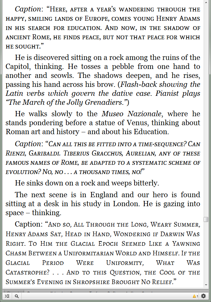 <p>“T<span class="smcaps">WENTY</span> Y<span class="smcaps">EARS</span> A<span class="smcaps">FTER</span> . . . H<span class="smcaps">ENRY</span> A<span class="smcaps">DAMS</span> I<span class="smcaps">S</span> N<span class="smcaps">O</span> L<span class="smcaps">ONGER</span> Y<span class="smcaps">OUNG</span>, <span class="smcaps">BUT</span> <span class="smcaps">IN</span> H<span class="smcaps">IS</span> H<span class="smcaps">EART</span> L<span class="smcaps">IES</span> S<span class="smcaps">TILL</span> <span class="smcaps">THE</span> H<span class="smcaps">UNGER</span> <span class="smcaps">FOR</span> E<span class="smcaps">DUCATION</span>. G<span class="smcaps">OING</span> F<span class="smcaps">ORWARD</span>, E<span class="smcaps">VER</span> F<span class="smcaps">ORWARD</span>, H<span class="smcaps">E</span> R<span class="smcaps">EALIZES</span> <span class="smcaps">AS</span> N<span class="smcaps">EVER</span> B<span class="smcaps">EFORE</span> <span class="smcaps">THAT</span> W<span class="smcaps">ITHOUT</span> T<span class="smcaps">HOUGHT</span> <span class="smcaps">IN</span> <span class="smcaps">THE</span> U<span class="smcaps">NIT</span>, T<span class="smcaps">HERE</span> C<span class="smcaps">AN</span> B<span class="smcaps">E</span> <span class="smcaps">NO</span> U<span class="smcaps">NITY</span>. T<span class="smcaps">HOUGHT</span> A<span class="smcaps">LONE</span> I<span class="smcaps">S</span> F<span class="smcaps">ORM</span>. M<span class="smcaps">IND</span> <span class="smcaps">AND</span> U<span class="smcaps">NITY</span> F<span class="smcaps">LOURISH</span> <span class="smcaps">OR</span> P<span class="smcaps">ERISH</span> T<span class="smcaps">OGETHER</span>.”</p> At the moment, wishing to lean towards READABILITY rather than PRETTY, also known as "Mimic the Print Book", I am leaning towards Monospace in normal Sentence Case. (Camel Caps are hard on the eyes in large quantities, I think.) What do you think? Last edited by GrannyGrump; 01-07-2016 at 02:49 AM. |