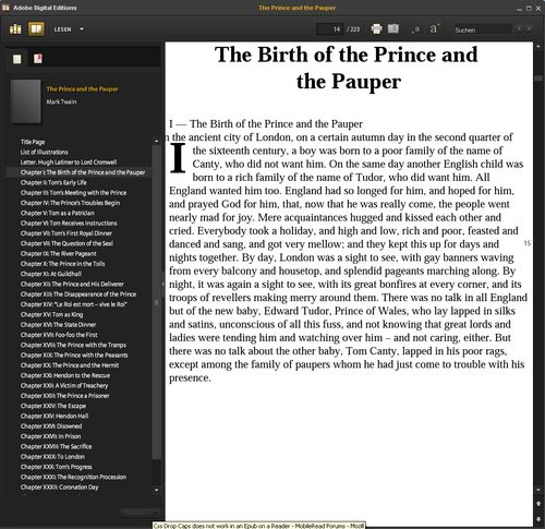 What I'm sure it's doing wrong is rendering the "I - The Birth of the Prince and the Pauper" line, it should be ignored in the text flow (and, ideally, displayed as a page header from the next page).