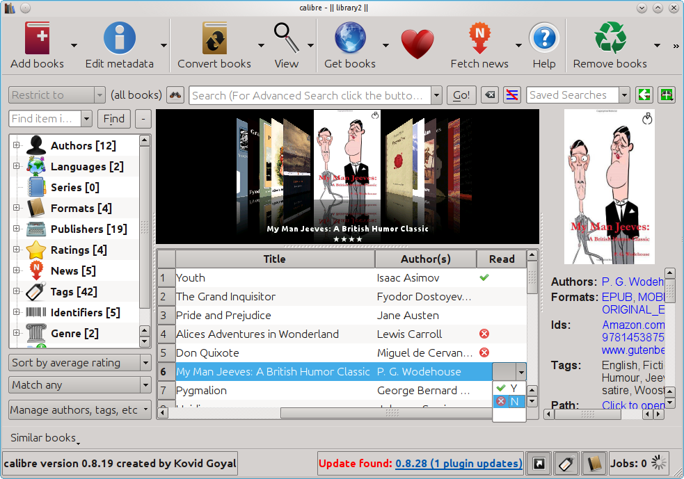 and let me know where it has gone As I mentioned earlier I am no wizz kid and it needs to be kept simple My version of Calibre is set for three columns I believe has a tick in that box anyway I think this example is getting on for what I require. I want to indicate in a column that I have read a book and the ones I have not read will have nothing in the column Then I would like to be able to sort my library of books showing only the unread ones, the read ones, or all books. If this tutorial can be modified to show the above that would be great Example Binary Yes/No type column: Here we are going to create a binary Yes/No type column with column heading "Read", look up name "read" and column type Yes/No. The entry Yes in this column indicates the book is read and No indicates the book is not yet read. After filling the entries and clicking OK in the window in the above figure a new column appears with title "Read" in the main calibre window. By double clicking in the position of the entries of this column a drop down box opens that allows you to select "Yes" or "No" or leave it blank as shown in the figure below. So you can now mark the read status of the ebooks in you collection as done for a few in the figure below. A green tick indicates Yes or read and a white cross in a red circle indicates No or not read. You can also leave the read status blank. |