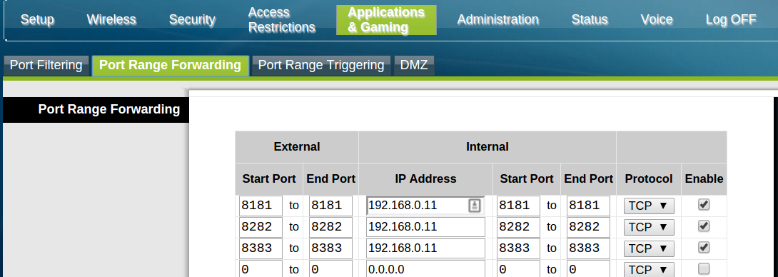 I tried to use telnet to get in, but the login was not the same as the router login. After 3 tries I got the msg that "telnet has been locked", LoL. Good o'le Megacable. I cannot change the router login, nor can I change the Static DNS settings. When I try to "Save" any of those, the router reboots and comes back up with their defaults back in. I am surprised I was able to change the wireless password in it. So, no bridged mode that I can see. It appears to let me change the port forwarding, so here is what I tried, based on this guide: portforward.com/help/doublerouterportforwarding.htm ---------------------------------------------------- Cisco Modem/Router- Local IP = 192.168.0.1 (default) DHCP On, Range 192.168.0.10 (default) Max Range DHCP Users = 119 (default) Connected Devices = 192.168.0.11 (My Asus Router's 'external IP address') Port Range Forwarding = 8181, 8282, 8383 to IP 192.168.0.11 (my router) Note: 8181 is the only one I have in use by Calibre at this point. But when/if I can get this working, I will use the terminal mode to launch 3 Calibre-Server sessions for the 3 separate libraries I want to share Asus RT-N16- External IP = 192.168.0.11 Local IP = 192.168.5.15 Port Forward = 8181, 8282, 8383, to IP 192.168.5.168 (My Linux PC with Calibre) ----------------------------------------------------- I have attached screenshots of the Port forward settings in the Cisco and Asus routers. But, this setup does not appear to work. Checked it with grc.com and it says the ports are "stealthed", which means they are not showing as open. And I checked it with yougetsignal.com and they are not showing open their either. I did remove the default Mint Linux firewall and installed the firewall-applet from Red Had, and added the 8181 port only for now for testing. That didn't help, so I saved the firewall settings and stopped it totally. Still no cigar... So, still stuck... |