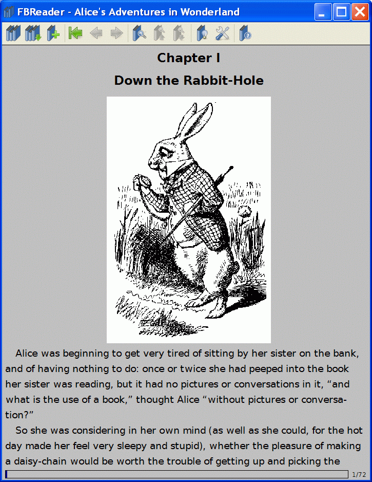 FBReader is commonly used on the Nokia Internet Tablets, on the iRex iLiad and Digital Reader, and is the basis for the ebook reader in OpenInkPot. The attached screenshots are from the 0.8.17 and 0.10.0 versions of Windows FBReader on an ePub. The 0.10.0 version reads the TOC, which was a major shortcoming of the previous version. |