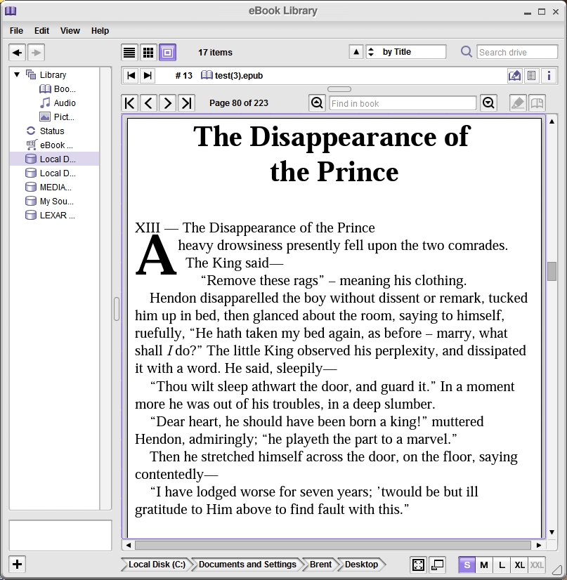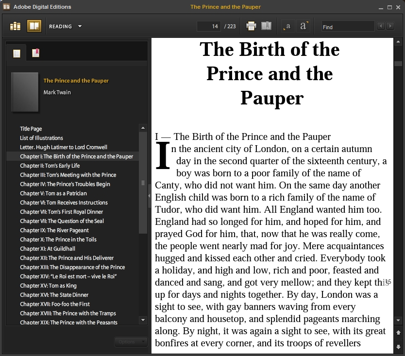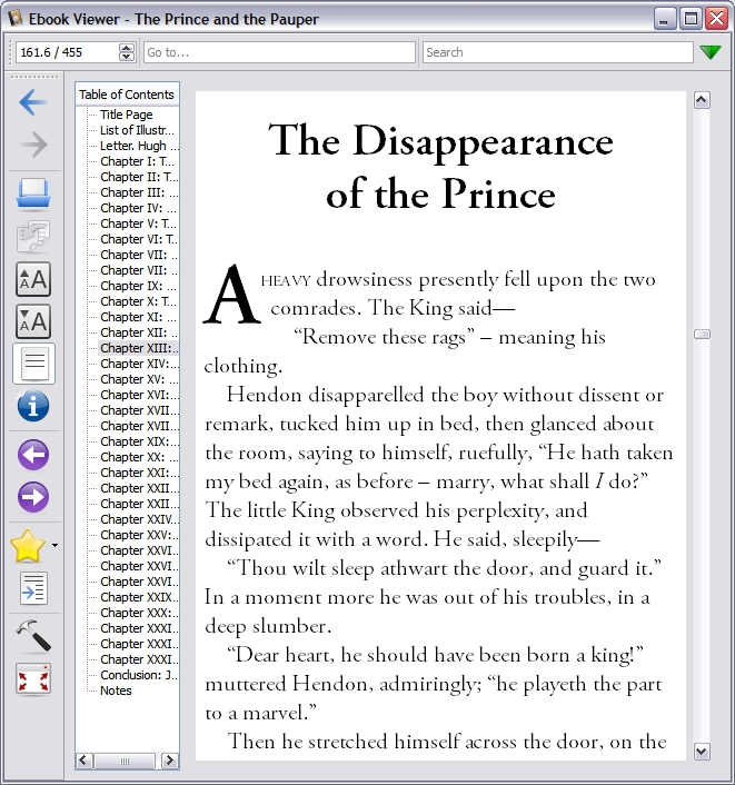 Stanza included this time for fun - hardly any formatting at all in Stanza, and no hyperlinking. Oh, one other thing I don't understand. Calibre is missing this line: "I — The Birth of the Prince and the Pauper" that all the other readers seem to pick up. Any ideas as to what we're seeing? -bjc |