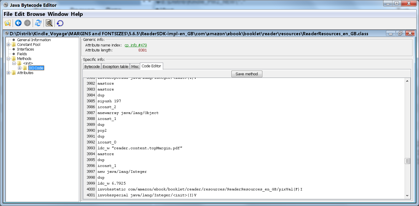 I copied file "/opt/amazon/ebook/lib/HTMLReader-impl-en_GB.jar" from KV to my PC to change margins. Now I just need to edit "ReaderSDK-impl-ln_LN.jar -> ReaderResources_ln_LN.class -> Methods -> <init> -> [0] Code" using this method https://www.mobileread.com/forums/sho....php?p=2699121 and to upload it back on KV. upd: It's working! KV 5.6.5 FW. I used 12.74 8.49 6.38 values for font.wordsperline.margin.list (see this post https://www.mobileread.com/forums/sho...66&postcount=1 ) Last edited by HarryT; 02-21-2016 at 09:27 AM. |