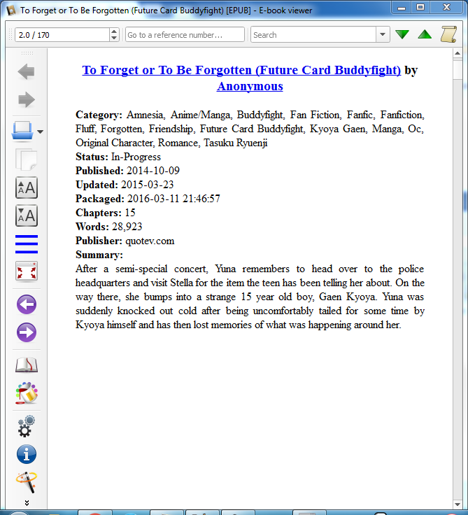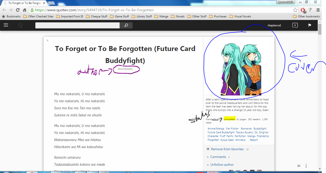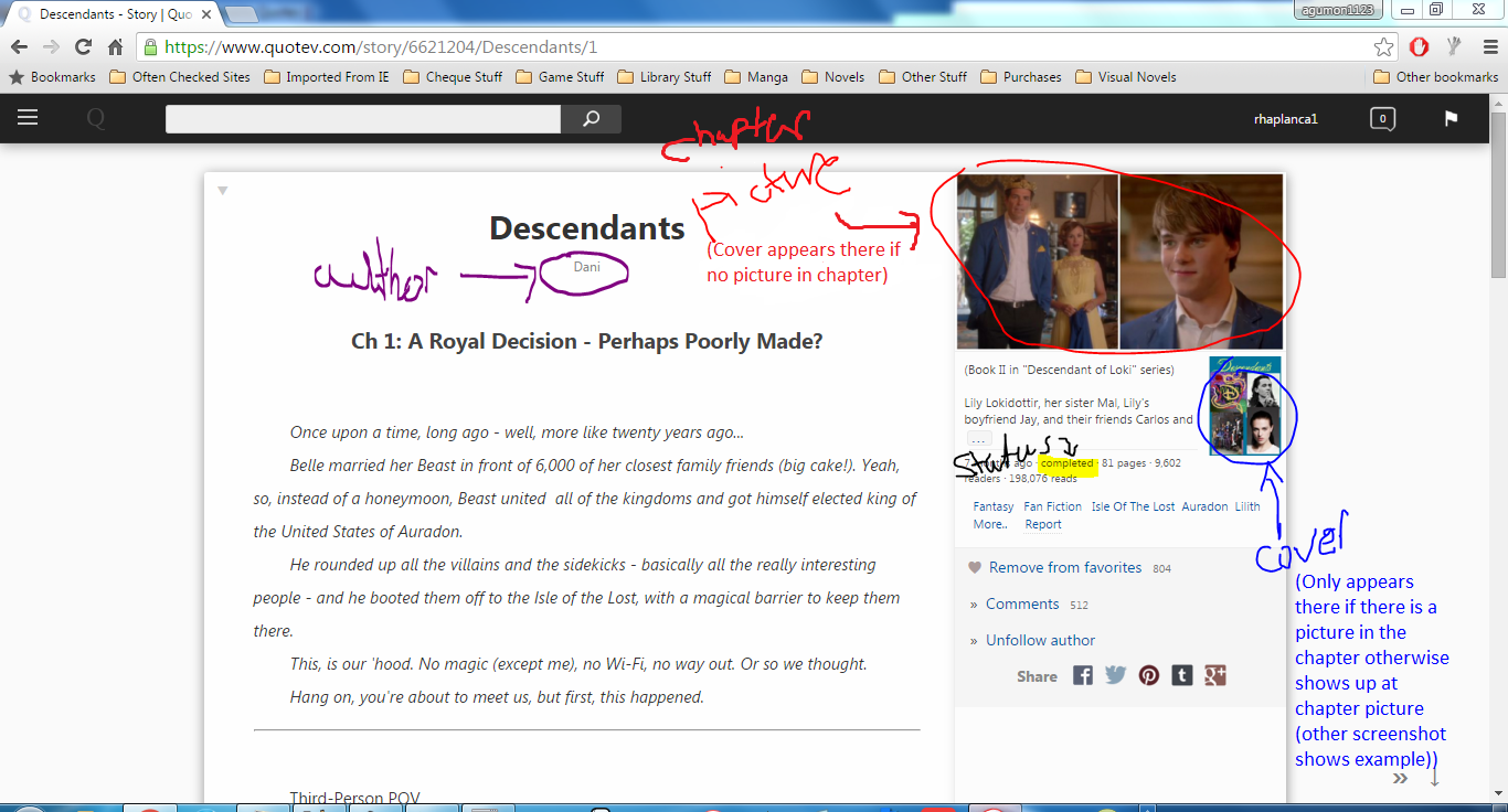 The new test version addresses problems with the author, status and favorites metadata. It also adds a feature to include chapter specific images in the chapters when they aren't the same as the cover image. This part is a new feature that may be less than perfect--I only tested with the two story URLs agumon1123 provided. New test version posted (direct link) 2016-03-12 - Yet more fixes for quotev.com changes. - Find and include chapter specific images for quotev.com. |