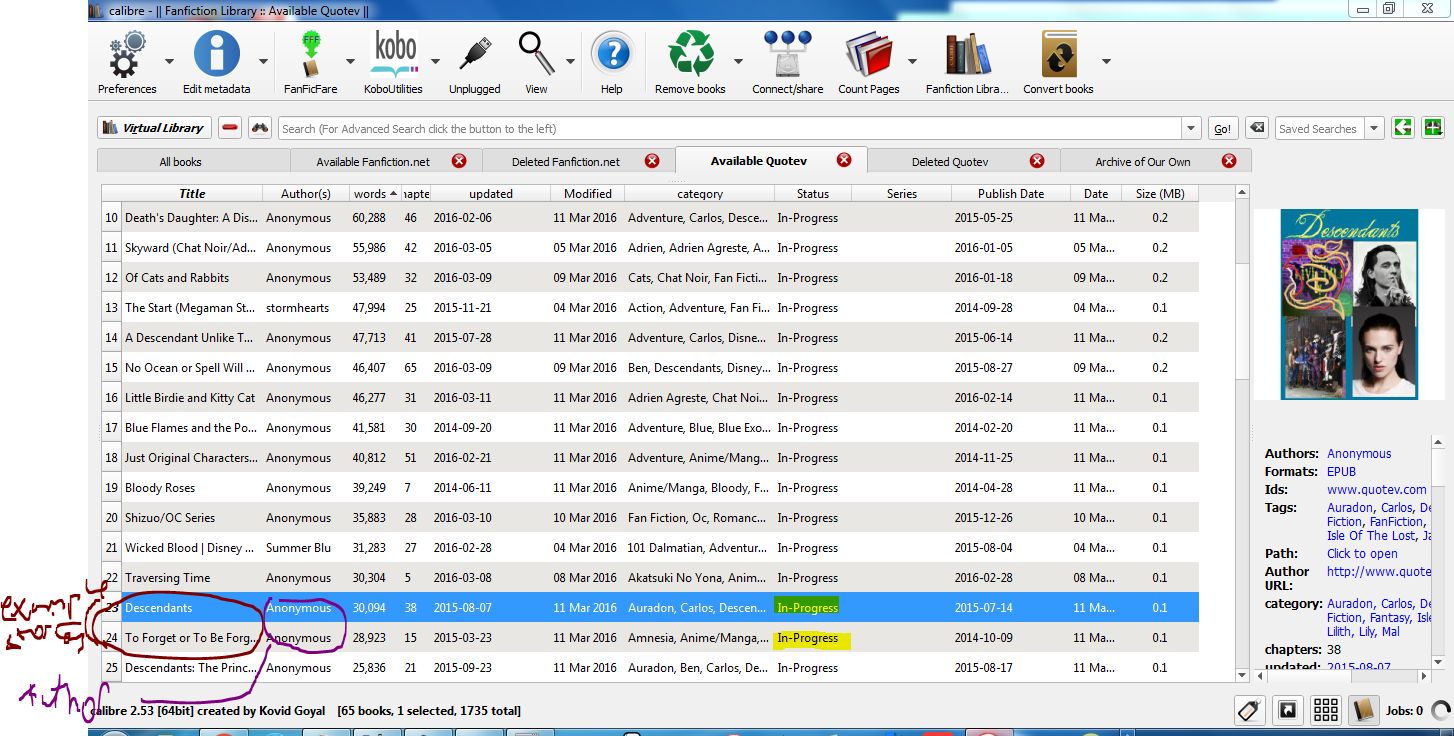When I download from qoutev i noticed that the story status in calibre keeps saying in progress even if the story is completed. Also is there any way for the author to show up instead of it staying anonymous and to download the pictures that are in the chapters? I included a log and some screenshots for examples.