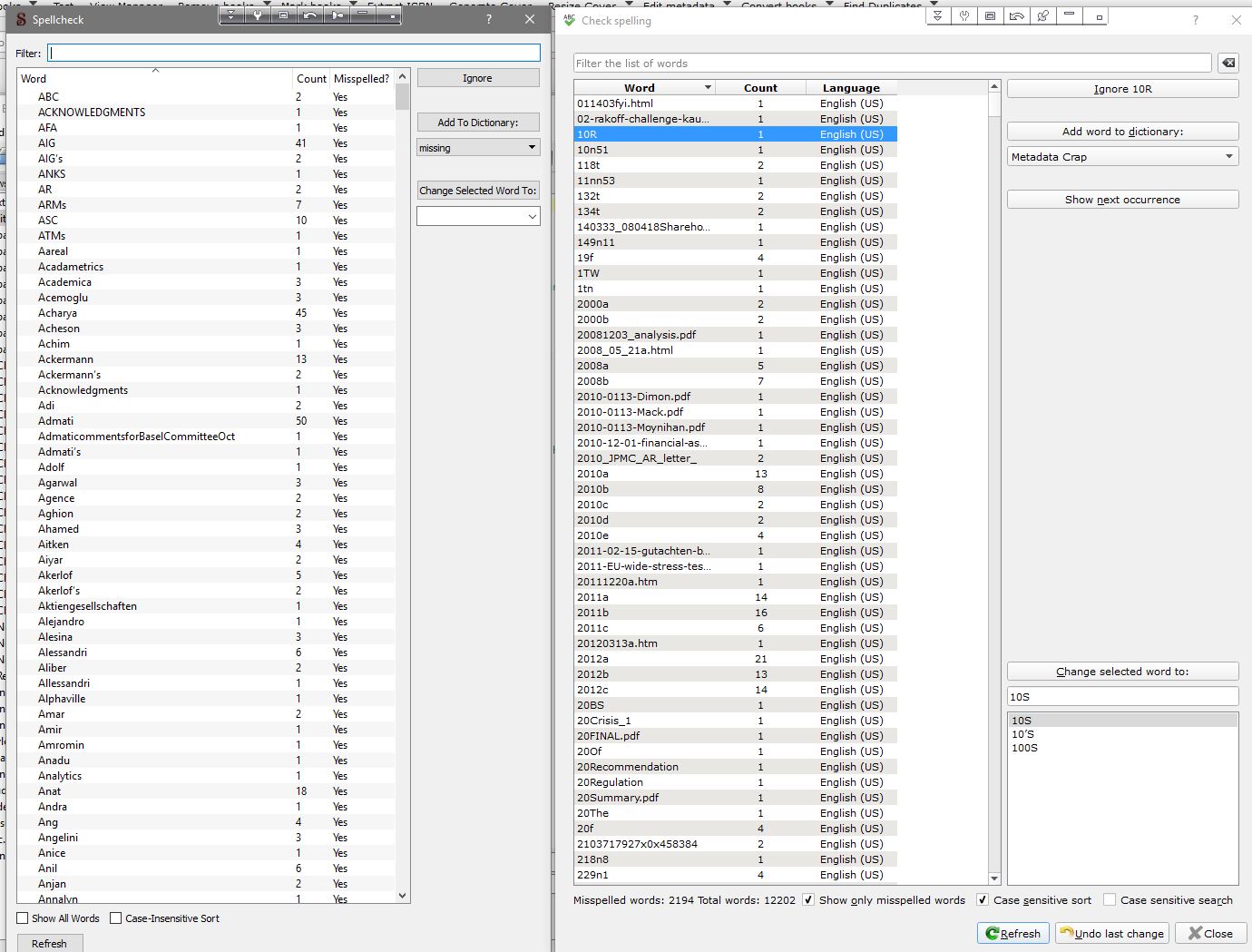 I raise it because the spell checker in Sigil does ignore some words with numbers, but the spell checker in calibre doesn't ignore any - but both purport to use hunspell. If you're interested spellcheck this -- untitled.epub -- in sigil and calibre The following is the same real book - sigil on the left, calibre on the right, with same dictionaries. In the following index entry, Calibre reports 235n32 as a misspelling, but Sigil doesn't - and it is not because of semantic settings. Code: