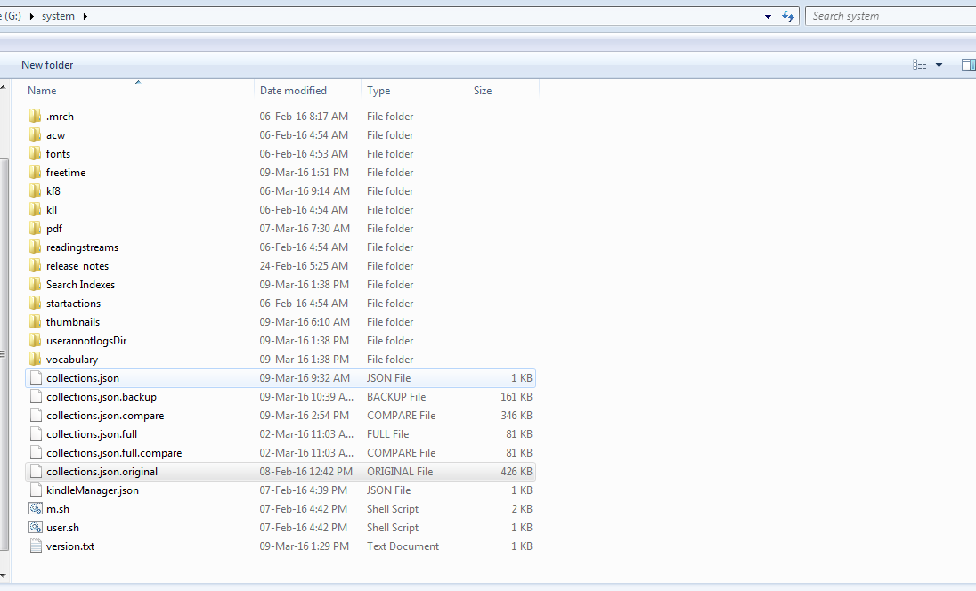 I followed your suggestion and i started looking for .json collection file in kindle.I could fine few files in the systems folder hidden in kindle drive of windows 7. There i found 7 json file only one ending with .json. I have attached an image of it. I do not know which one should i delete, if at all, to start creating fresh collections. Am I in the right folder to delete the json file?? I was wondering if deleting these .json files from system hidden folder would not harm my device in any way or prevent it from starting up. And i am following the backdoor thread and 5.6.5 jailbreak release thread, very closely, for blocking updates. Currently,I have 185 mb free space and i have only created update.bin.partial folder in the root directory. It seems to have taken care of stopping the update for me even when the space was 500mb. That is what the sole thing i have done and checked to keep away silent updates from kindle. Please take a look at the attachment and guide me which file i may have to delete to start collections working again. Thank you knc1. Last edited by mitra; 03-09-2016 at 09:43 AM. |