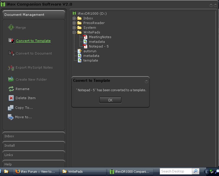 http://www.getupanddiy.com/projects/...dex.html#Links Of specific interest when reinstalling the software are these ones: Card Restore download: http://support.irexnet.com/index.php...id=27&nav=0,17 How to update your DR1000s http://support.irexnet.com/index.php...cleid=79&nav=0 Missing companion software: https://www.mobileread.com/forums/showthread.php?t=30320 Hang in there though- when the 1.5 version of the software comes out life SHOULD be easier. |