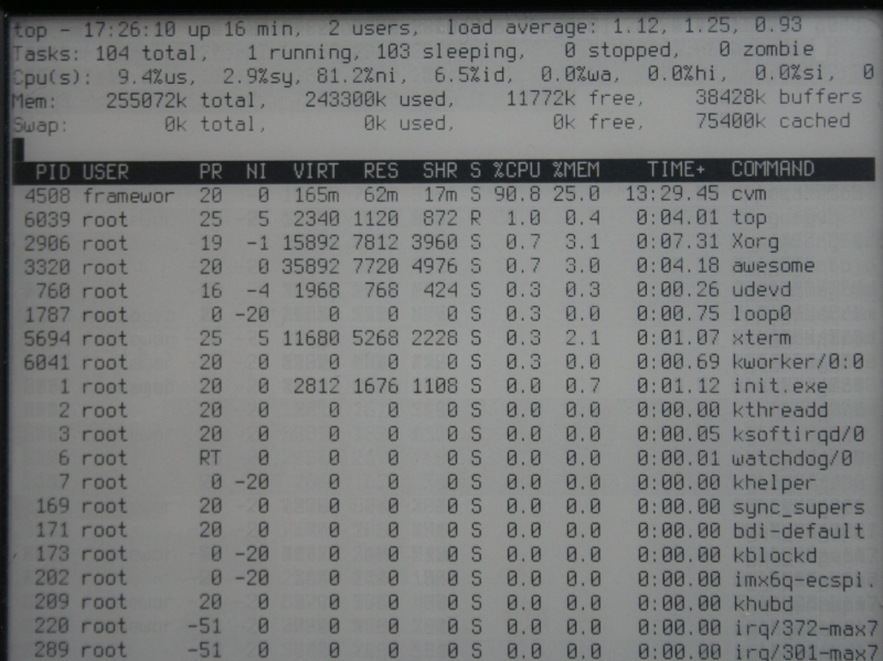 Simultaniously touch two diagonal corners == screenprint. But that was good enough - it showed the same thing I saw on my 5.6.1.1 I just returned from morning errands, for Lunch I'll look at those two config files. A note on what you can't see (without a serial port connection) - - With sshd and telnetd 'down' and the USB storage exported over the USB cable - - cvm isn't even running (it isn't on the process list - only upstart is mentioned as waiting to start cvm). . . . AND everything about the 'top' display looks like an idle device (I.E: as expected). So if the problem is in something that cvm is running - that means somewhere in the closed source (Java) part of the system. |