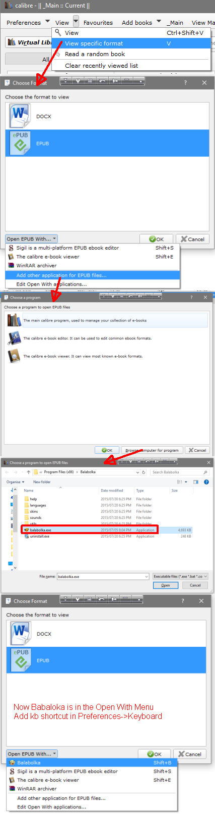 Assuming your books are in epub format: 1. Highlight a book in the main calibre window. 2. Right-click on the word 'EPUB' in Formats in the Book details panel and choose 'Open EPUB with...' from the context menu. 3. Choose 'Add other application for EPUB files' and navigate to your copy of balabolka.exe in Program Files (x86) and double-click it. Your epub will open in Balabolka and off you go. Once you've done this, for all further epubs you only need to do Steps 1 and 2 and choose Balabolka from the application list you are offered in Step 2. |