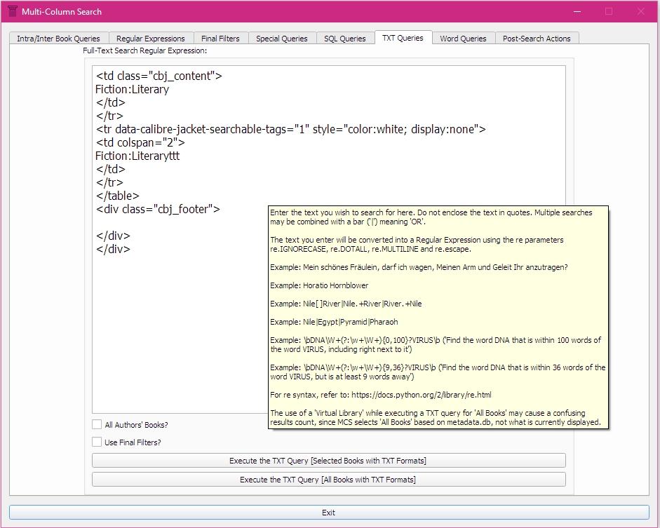 You can use the Multi-Column Search plug-in to do full-text searches (using regular expressions) on selected epubs after converting them to .txt files, but still with the original html tags. Pandoc can do that. See the attached example which includes the explanatory ToolTips. DaltonST |