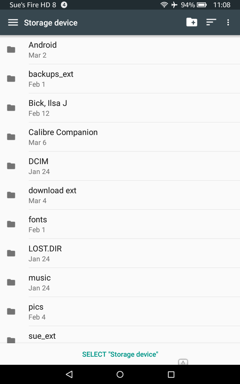 First screen - choose Select Second screen choose Select "Storage Device" on bottom If you don't see Storage Device on the bottom, you may need to tap the three lines in the upper left corner. Then your screen will look like this and you need to choose it here first and then it should show up like the previous screen. |