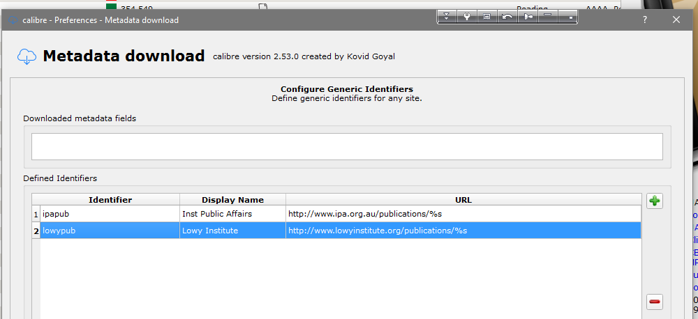 If by 'a dialog to edit the identifiers' you mean this : That's for isbn - you'd have to introduce something to select what you call an Identifier and what I call a Source - here's what I have configured To enter a value I need to remember the identifier, then type it e.g. 'lowypub:', 'ipapub:' etc, and then typically paste in rest of the URL - eg 'islamic-state-propaganda-and-mainstream-media' or '2471/lessons-from-private-cities' Ideally I would like a list containing "Lowy Institute", "Inst Public Affairs" etc with a column to enter the %s value(s). In metadata edit I suggest an additional button between the clipboard isbn icon and the text box; similar to the one on Tags that pops the Tag Editor, except it would pop the Custom <whatever> Editor. Making that editor available with Shift+F2 as chaley did for the Tag Editor wont be 'easy' because there's no Custom <whatever> column. Maybe it could be wrapped in something that could be selected from a toolbar and be assigned a keyboard short cut. Oh - when customising the Generic Identifiers I was able to Escape out of the dialogue without Saving, even though I added 2 and deleted 1 row. Is an "are you sure" message possible. BR Last edited by BetterRed; 03-29-2016 at 01:05 AM. |