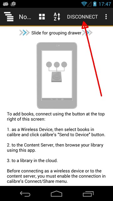 If you initialized CC and deleted all the book files from the tablet then at this point you should see something like the following: The "Disconnect" menu item should be there (the item pointed at by the red arrow), and (as shown) you should see no books. If you tap the "Device" button in calibre you should see no books. Now tap the Library button in calibre. You should see your PDFs. There will be an "On Device" column that is empty. Select 2 or 3 books, then tap the "Send to device" button in calibre. CC will show progress messages. Calibre will show that there is a "Job" running. When the books are sent, calibre will show a green check mark next to the books. CC will show the books. The title you see in CC should be exactly the same as the title you see in calibre. If we are OK at this point -- the metadata in CC is correct -- then select more books and send them to CC. From this point on, whenever you connect CC to caliber as a wireless device, CC and calibre will cooperate to update the metadata for the books. That means that if you change a title or an author in calibre then that information will automatically change in CC next time you connect. |