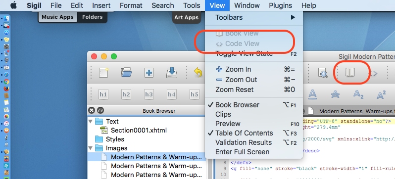 Can someone help me w/the "Book View" for files in Sigil and loading SVG's into Calibre?