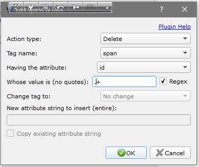 I'd still like it in Modify because a) I could do it in bulk and b) I always run Modify over new epubs to remove the crud like covers and non cd metadata. To use the Toolbag I have to fire up the editor, click a button and tell the toolbag what to do (every time - hint, hint DD). But at least now when they do irritate me, which is in the editor, I can get rid of them toot sweet Thanks for the tip. BR |