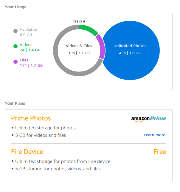 I can't find the details now, but I think the free storage is 5GB if you are a Kindle/Fire owner, plus another 5GB if you are a Prime subscriber. The storage can be used for whatever you like. If you buy mp3 from Amazon or upload photos from a Fire device, that doesn't count against the limit.