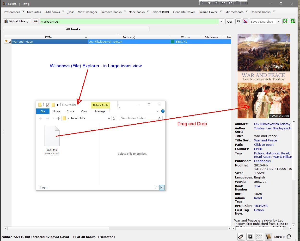The simplest way to add an additional format to an existing book is to select (highlight) the book in the book list, then drag and drop the additional format from file manager (or desktop) onto the book details panel -- normally a sidebar on the right side of window, unless you set it to display at the bottom. If you can't see the book details sidebar panel press Alt+Shift+D. I don't understand what you mean not being blue like Kindle - if you're referring to the fact that the AZW3 file doesn't have an icon, that's because AZW3 doesn't have a default file association for the Open verb. You can set those in Control Panel->Default programs. The only thing that looks like a jpg in your image is the file called cover, which is present in all book files and is always a jpg. Can I suggest you change Folder Options-View to not Hide extensions for known file types. BR |