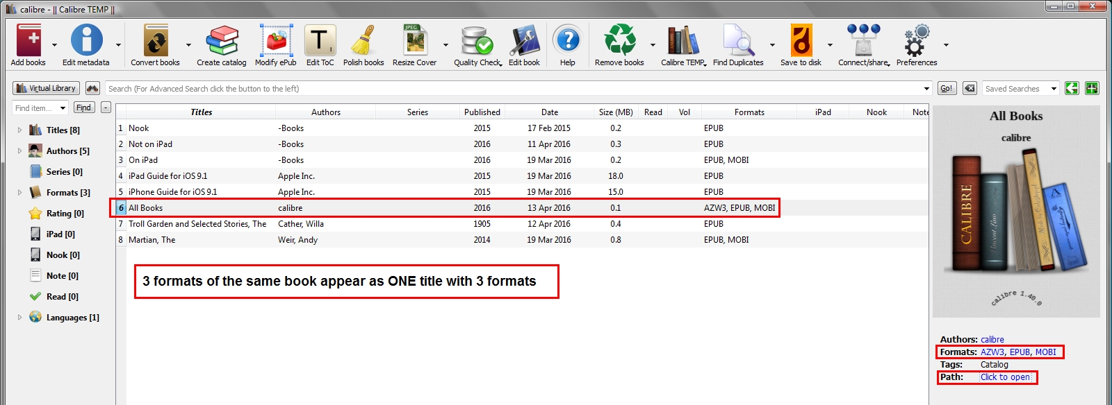 The last posts from BetterRed and theducks are pretty clear about adding a book with a different format, but if you have any questions, please post back. I use a "playground" calibre library for testing book format. I've put a book titled "All Books" in the library. It has 3 formats of the same book. I've attached 3 pictures ... if you still have questions, just holler back! I run an OLD version of calibre on an OLD Vista PC. Your screens may not be exactly the same as mine. Marty |