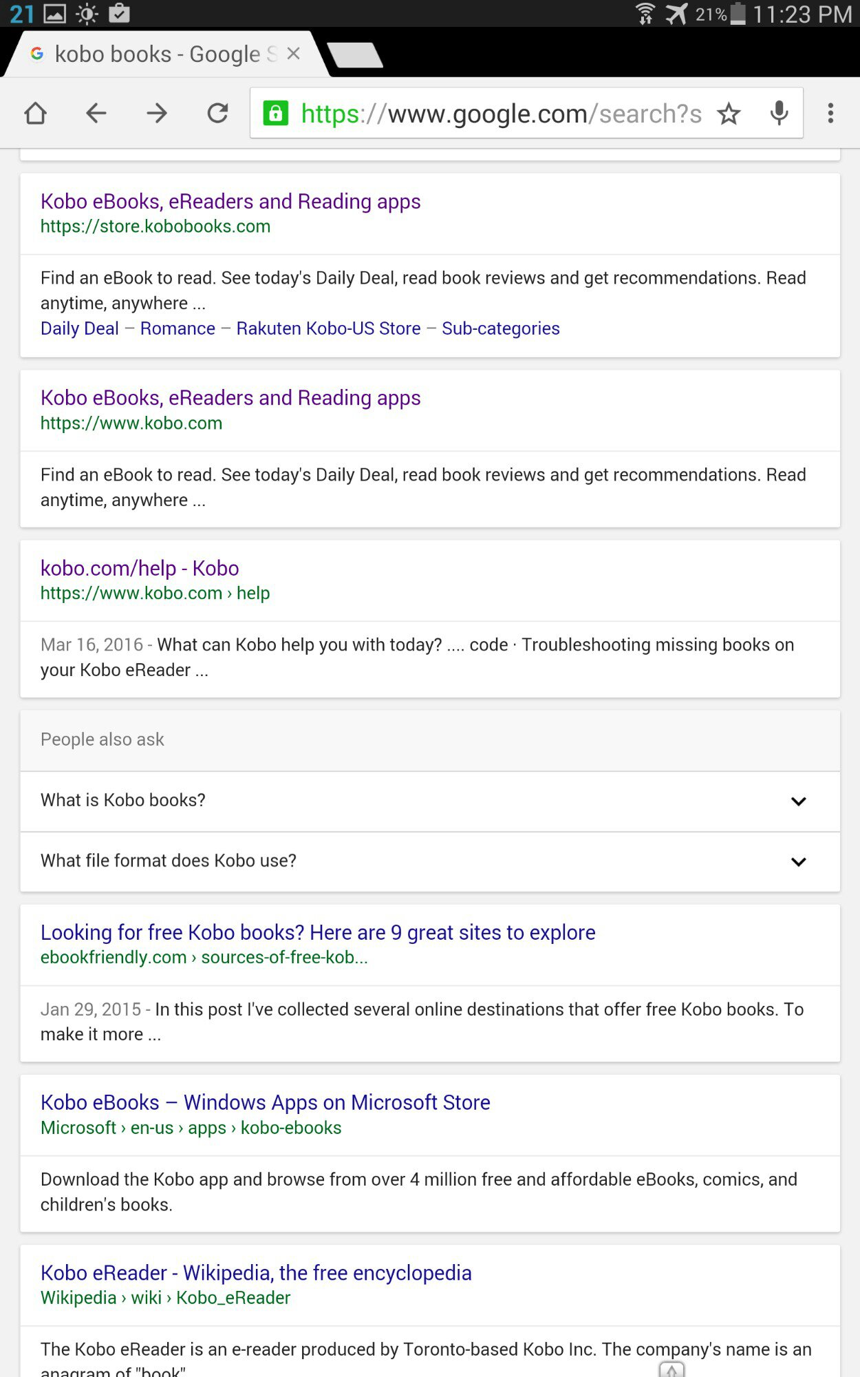 Here's a screenshot of my library using Chrome and search from Google on my tablet. It looks like the Kobo app and settings is not Chrome settings, it's Kobo settings. I tapped on "Death by a Honeybee" to try to figure out what it was and it opened it up to read. I never purchased it so who knows where it came from. I used Chrome successfully yesterday, so who knows what happened today. If I choose desktop version in Chrome before I tap the link from Google search I get the actual website. Does anybody see the same thing on a tablet?