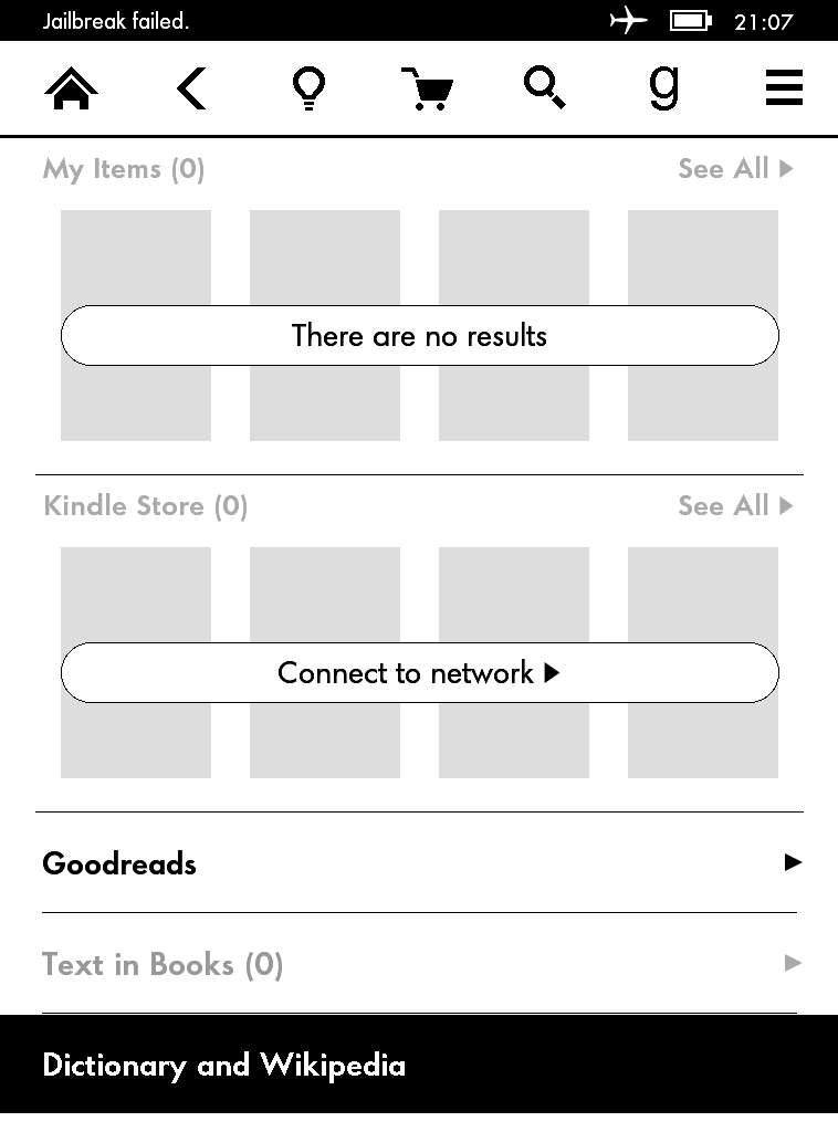 Unfortunately I can't jailbrake it I have PW2 with Firmware 5.6.5 (2730300038). I upload files from "jb" to my Kindle, start browser, enter the address, press STEP1, cancel aeroplan mode off, back, press STEP2, massage on top bar was "JB Starting", next "Run ;fc-cache in the search bar.", waiting about minute and unfortunatelly last message "Jailbreak failed".What's wrong with my steps? Am I forgot about something? |