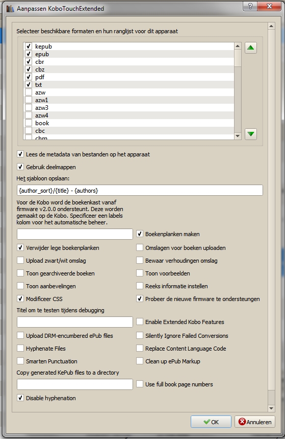 I use your driver because it has the function to disable the hyphenation. Book 2 Karen-Rose Niemand zeggen gives the error: Failed to parse 'Karen Rose' by 'Niemand zeggen' with error: 'f225cb12131a.html' (file: calibre_plugins.kobotouch_extended.container, line: 172) Traceback (most recent call last): File "site-packages\calibre\gui2\device.py", line 87, in run File "site-packages\calibre\gui2\device.py", line 584, in _upload_books File "calibre_plugins.kobotouch_extended.device.driver" , line 294, in upload_books File "site-packages\calibre\devices\kobo\driver.py", line 1918, in upload_books File "calibre_plugins.kobotouch_extended.device.driver" , line 231, in _modify_epub InvalidEPub: Failed to parse 'Karen Rose' by 'Niemand zeggen' with error: 'f225cb12131a.html' (file: calibre_plugins.kobotouch_extended.container, line: 172) Last edited by Nick_1964; 05-15-2016 at 06:57 AM. |