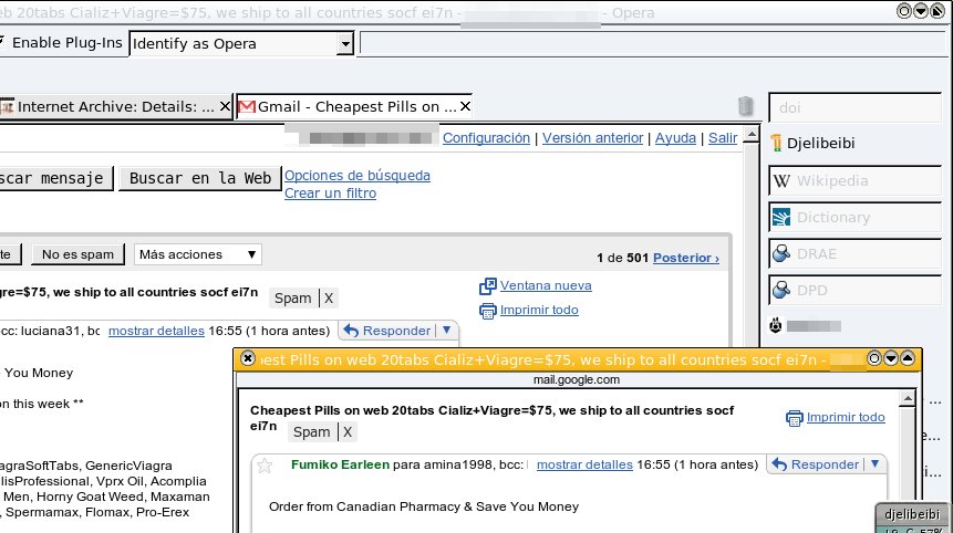 The first image shows my normal setup, I clicked on the green link ("new window") and the "window" marked in blue appeared, which is represented by the button marked in red in the tab bar. You can see how this window disappears behind the right bar, where I have some search boxes and blurred out links. (Ignore the "djelibeibi" thing on the bottom right corner, it's just another always-on-top app.) The second image is just after I right-clicked on the tab button and selected "detach" (and then resized and moved the now desktop-level Opera window). Note that now the new window is a full Opera one, with button bar, tab bar, etc., but it's only limited by the desktop. For the third image I checked the "Open windows instead of tabs" option in the preferences, as I said, and clicked again on the "new window" link. Now the new window does not have the button bars, but again is not limited by the parent Opera window. Isn't this what you meant? |
