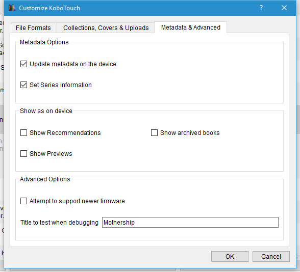 I made a comment in a thread earlier in the year about options seeming to the bane of my life. That was about the options for a plugin, but the set of options that I was really thinking of are those in the drivers. Or specifically, the extra customisation options in the KoboTouch driver. Any time I need to change these, it's a pain. Especially if I want to group the changes.