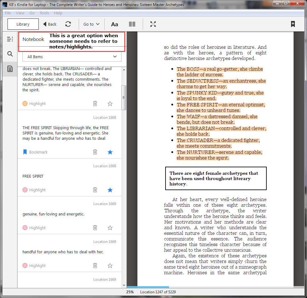 Before anyone says anything I do use a desktop regularly to read (eBooks), study and make notes for lectures. There are a couple of very useful features I would like to see added to the Ebook Viewer. The Kindle Desktop App has these and they are very helpful and used regularly. Calibre E-book Viewer Wish List From Kindle Desktop App reader: 1. When I copy information from the Kindle Desktop App it provides the information below. This is great for referring back to where the information originated and for notes when teaching, writing, studying, etc. Also, if someone wanted to read a certain passage again. Cowden, Tami D.; LaFever, Carolyn; Viders, Sue (2013-12-16). The Complete Writer's Guide to Heroes and Heroines: Sixteen Master Archetypes (Kindle Locations 1248-1253). Archetype Press. Kindle Edition. 2. The ability to see the items I highlighted in a notebook. This is great for a number of reasons: reference, studying, teaching, etc. The notebook area is not resizeable which would be a great feature. |