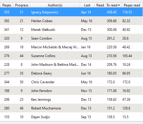 I would like to have: a) a column that shows the number of pages read, b) a column that shows the number of pages left. The rough formulas would be: a) #progress/100 x #pages b) (100-#progress)/100 x #pages which, translated into the Calibre template language, look as follows: a) {#calc:'multiply(divide(field('#progress'), 100), field('#pages'))'} b) {#calc:'multiply(divide(subtract(100, field('#progress')), 100), field('#pages'))'} This seems to render correct results. Still, I have some doubts and questions: 1) I don't quite get the very beginning: do I have to put the name of field (#calc: )? It doesn't seem to matter which field I put there (still not quite getting the syntax ). 2) What function should I use so that the calculations are made only if #progress is not empty, and otherwise the target column is left blank? 3) Is it possible to sort such a calculated column in an ascending/descending order like a regular numerical column, and if so, how to achieve that? At the moment, sorting is kind of alphabetical, based on the first digit, then the second digit etc. while ignoring the order of magnitude, i.e. 40 and 400 would be between 4 and 5. |