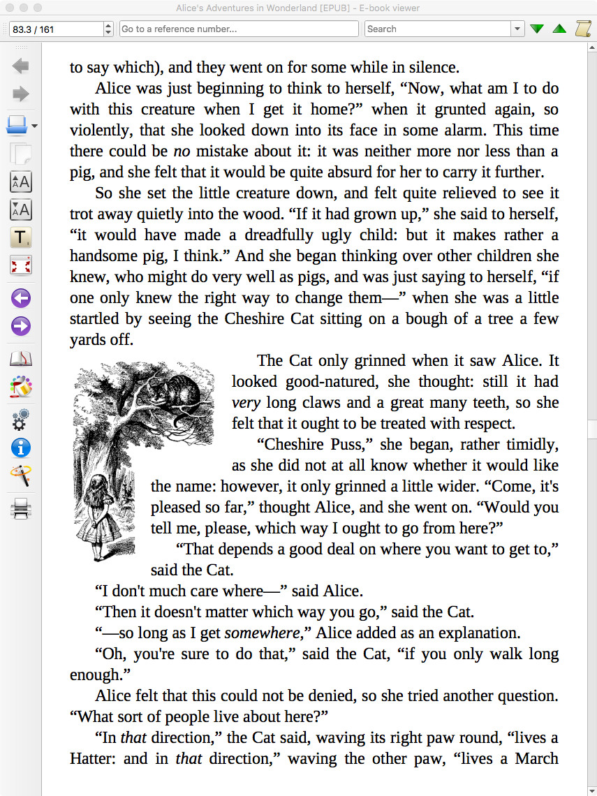 This is way we describe BookMaster on our webpage: BookMaster is a beautiful, sophisticated, feature-rich and well-integrated ebook reader app for iPad that will pleasantly change the way you read, learn and organize. As for EPUB reading, text and background color customization is relatively easy and common these days, but the ability to turn practically ANY (beautiful) image into a usable (beautiful) background image for comfortable reading is not. For users who have a high aesthetic requirement, BookMaster gives her an easy-to-use tool for such unusual level of customization. One of the biggest advantages of EPUB is that its core representation is based on the powerful and sophisticated open standard HTML and CSS (of webpages), rather than some weaker or proprietary standard. Some of the earlier EPUB books, like those converted from Project Gutenberg's TXT ebooks, did not really take full advantage of the layout expressiveness of EPUB. Thus, earlier generations of reader apps do not pay much attention to faithfully rendering according to Publisher's Default. In our test suite, we have a lot of beautifully designed ebooks by well-known publishers. For these books, you really want to preserve their publisher's default and modify only one or a few parameters, rather than turning off their publisher's default and let some reader app to re-do layout from scratch. Alice's Adventures in Wonderland (Maplepop Edition) (AAIW), bundled with BookMaster, is just one such example intended to illustrate the importance of the ability of do user-override of layout parameters on top of Publisher's Default. It's interesting to use this ebook as a very useful test case to evaluate the sophistication of the EPUB layout engine under the hood. You may export the book to another app on the same device via "Send to...". Attached is a screenshot of a page of Chapter VI. Pig and Pepper of AAIW, taken with Calibre's e-book viewer. It does render faithfully. So does BookMaster (of course!) But some other reader apps that are discussed a lot recently on mobilread.com do not pass this test. In general, BookMaster prefers to deliver sophisticated features without a plethora of options. It just works! ![]() Quote: