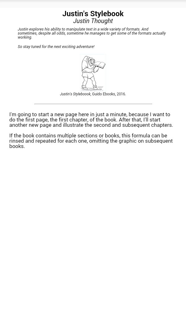 I have a fairly extensive collection of e-books from various authors, and I have always thought that it would be logical that each of the books from each author would look best if they displayed consistently. Now, whether you're finding your e-books from an online resource for little or no cost; or buying them from the big publishing houses, you're likely to get a devil's-brew of formatting, ranging from the elegant to what I call "word soup" with no formatting or chapter breaks at all. Therefore, I undertook the process of trying to reformat some of my more favorite ones into a consistent format. Now, my pick-up app for reading is Moon+ Reader because I like the formatting options it offers. I also often make notes within the book, and Moon+ offers this feature. The app also provides reading stats, and keeps track of those books that have already bitten the dust. Now, I noticed that much of my careful formatting was lost in Moon+, and I began to be curious about what the display would look like on other e-reader apps. So I went to the Play Store, and I loaded another e-reader that I had seen recommended in this forum; then loaded several more by using the scientific selection process of choosing the first one at the bottom of the Play Store screen labeled "People who loaded this also loaded..." Then, I slapped the ebook that I created to hold the formats that I use regularly in my upgrading process onto my venerable Samsung tablet, and started comparing the results. I was aghast! I discovered that there was absolutely no consistency across software platforms whatsoever. One e-reader would give fairly good results on one of my favorite formats; and look horrible when displaying another. Then I began to be curious about how these favorite formats would look on some of the dedicated e-readers discussed in this forum. I realized that to find the answer to that question, I would have to invest in a couple-hundred different e-readers. I tapped my rich uncle for the funds to do this, but he is mouldering away in a debtors prison in Argentina, and wasn't able to help me, and I don't have the skills (or desire) to create a go-fund-me site to finance this project. (I'd probably use the money to spend a couple of weeks--or months--or the rest of my life--in idyllic bliss in some out-of-the-way spot like Cancun if it were successful anyway.) Instead, along with posting screenshots of the results of my research so far, I'm also making my format book available to you, whom I assume already have one of those aforementioned dedicated e-readers. I'd love it if you could take screenshots of the format that you get and post them here. Maybe from this, others could be guided in their choice of their next e-reader. One thing I have concluded from this little project (hobbies and other time-wasters sound SO much more important and meaningful if you call them "projects") is that there needs to be an establishment of some kind of standards for e-readers, just as the electronics industry managed to develop a standard for video recorders way back in the '80s; just to prevent us from having to choke down the occasional dinner of word soup. Anybody want to post their results? Now, if I can get this forum to cooperate with me, I'm going to post the screenshots for the various readers for each of the more important formats I have developed, below. They are, in order, a screenshot of how it looks in Sigil; next a screenshot of the presentation within Calibre on my computer. Not surprisingly, those are pretty much the way I wanted the pages to look. Following that, in order, are the results for Aldiko Reader, Cool Reader, FBReader, Gitden Reader, Lithium, Moon+ Reader, PocketBook, Supreader, and UB Reader. You judge for yourself which of those give the best presentation. This first is a title page I use for all my e-books, with the title, author, a short description, and a thumbnail of the cover. Below the separator, I can add any copyright information, dedications, and epigraphs. If there's any interest in this thread, and if the mods don't come in and torch this post because I did something wrong, I'll come back and post some screenshots of other pages. But at the bottom (I think), there's a link for my stylebook. Give it a shot on your favorite e-reader, and I'd be interested in seeing what it looks like there. |