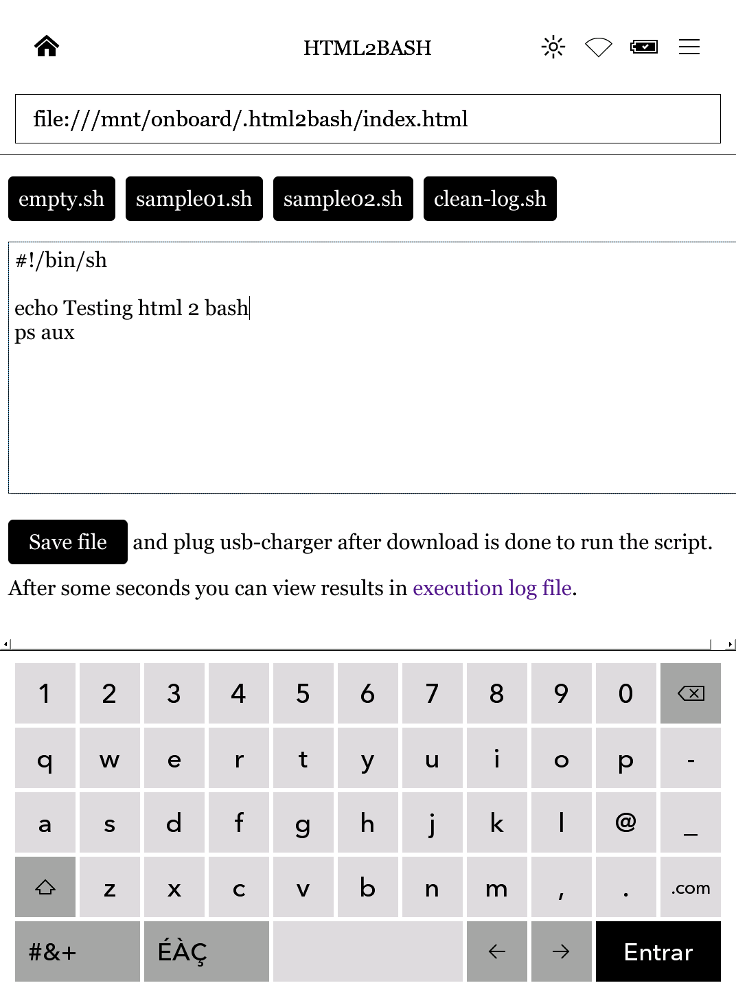 Like khd-autopatch, script is trigered when device is connected to a usb-charger. From Kobo browser we can write our commands to run, or load our custom scripts. With some internal javascript tricks, scripts are saved and we can plug usb-charger to force its run and see results. See requirements and notes on readme.txt: Spoiler: