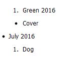 <div><ol><li>Green 2016</li></ol><ul><li>Cover</li></ul><li>July 2016</li><ol><li>Dog</li></ol></div>