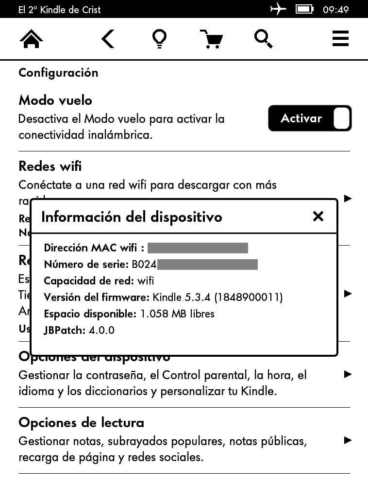 No sé si valdrá para otras versiones, es cuestión de probar Para los mas despistados...poner en modo vuelo...evitaran sorpresas Con el paso a la última versión de firmware del KP(kindle Paperwhite) hemos perdido la posibilidad de seguir usando el JBPatch. Una forma de volver a recuperar su uso es hacer un downgrade a nuestro Kindle, para ello solo hay que hacer unos pequeños ajustes en este. Para poder” degradar”( downgrade ) el KP desde la versión 5.6.1.x tenemos que seguir los siguientes pasos: 1º Degradar la versión del firmware desde la 5.6.1.x a la 5.3.3. Para ello usaremos el siguiente archivo El procedimiento a seguir es el siguiente: - Conectar el KP al ordenador - Subir el archivo a la raíz del KP - Sin desconectar este del ordenador, pulsar el botón de apagado del KP hasta que se reinicie. - Terminada la actualización desconectamos y comprobamos que se ha efectuado la actualización. 2º Bajar la versión del firmware 5.3.4. Desde este repositorio y procedemos como en el 1º paso ................*Como paso intermedio ir a: Nota 3º Bajamos el JBPatch desde este repositorio y seguimos las instrucciones de instalación de Ixtab 4º Una vez instalado comprobamos que se ha efectuado correctamente su creación, para ello nos dirigimos a Configuración/Información de dispositivo. Nota. *Como paso intermedio, antes de instalar el JBPatch tenemos que realizar el jailbreack a nuestro dispositivo. El nuevo archivo se llama: Update_jailbreak_bridge_1.14.N_install.bin Proceso en video Continuamos con el procedimiento descrito en el punto 3º Si después de realizar la instalación del JBPatch nos apareciese el mensaje de que no tenemos el jailbreack hecho, descargaremos este archivo y reiniciaremos el sitema, tal como en el punto 1º, de esta forma se actualizarán los componentes de este. Como siempre, la responsabilidad de lo que se hace corresponde a cada uno ![]() ;-)) Last edited by cristbo; 07-08-2016 at 05:23 AM. |