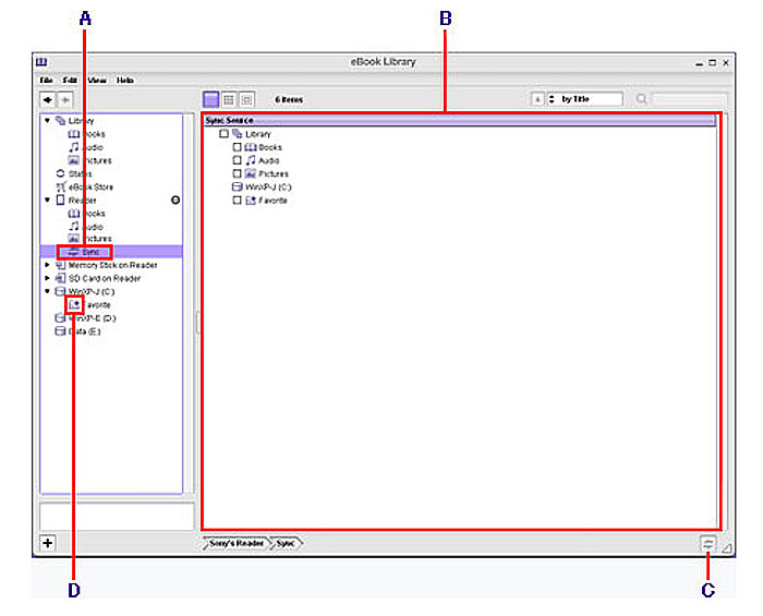 Cassidym, judging from your image, you have not clicked on the "sync" tab on the left panel yet (which is "A" on the image I uploaded). Expand the Sony reader tab by clicking on the arrow beside the Sony reader icon on the left panel, and then click on "sync".