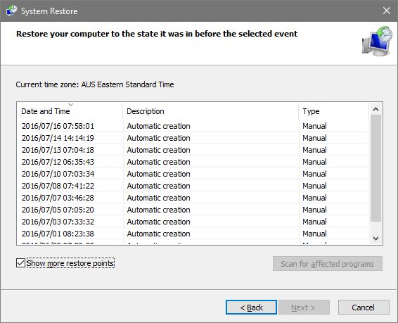 When you tried the System Restore you should have seen something like the following. If you didn't get multiple dates that probably means your son has tweaked Windows to limit Restore Point retention to most recent only Ψ² BR |