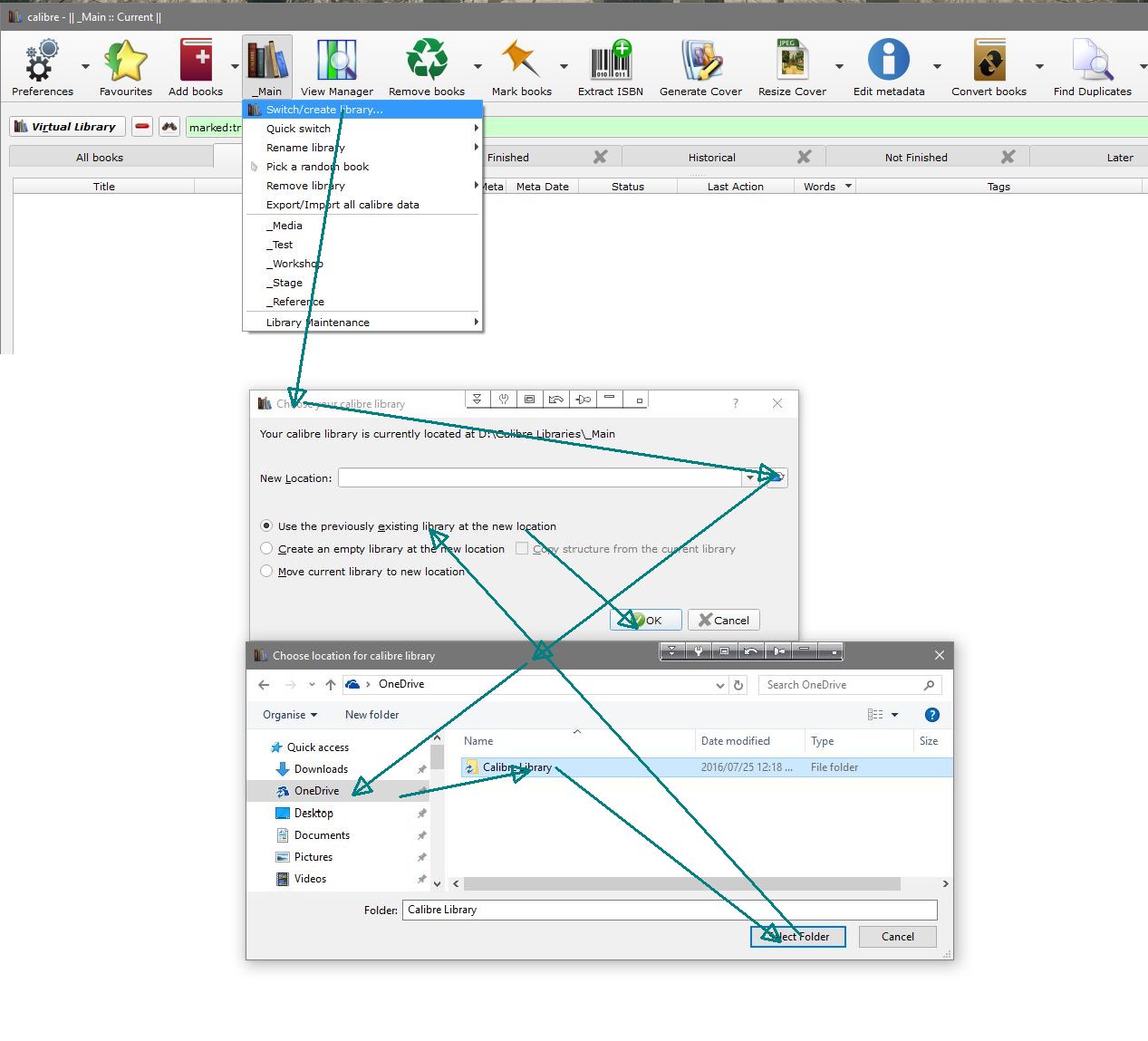 Unfortunately I don't have access to my old computer. I have my Library backed up in onedrive and it is from there that I am having difficulty moving it into Calibre.