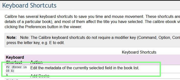 To edit fields is sometimes a little cumbersome on OSX. The first click is selecting the book, the second one to start editing. But once your were in editing editing mode you must not click on the book again, it immediately opens the field you clicked one. You must hit "Enter" and Esc to get in the normal selecting mode again. I wonder if I am missing something here. I would appreciate a dedicated shortcut for editing mode but could not find one.