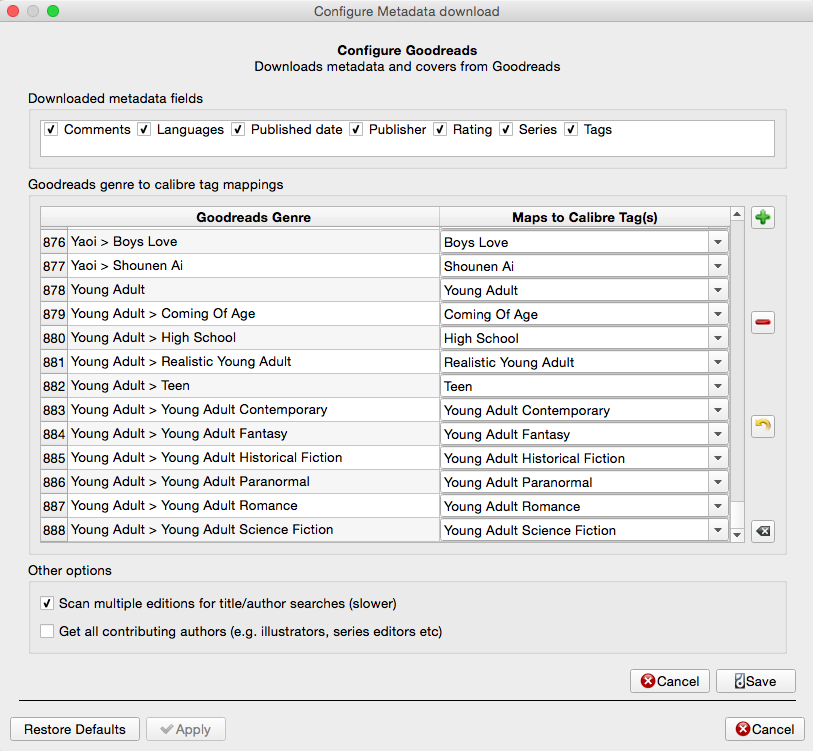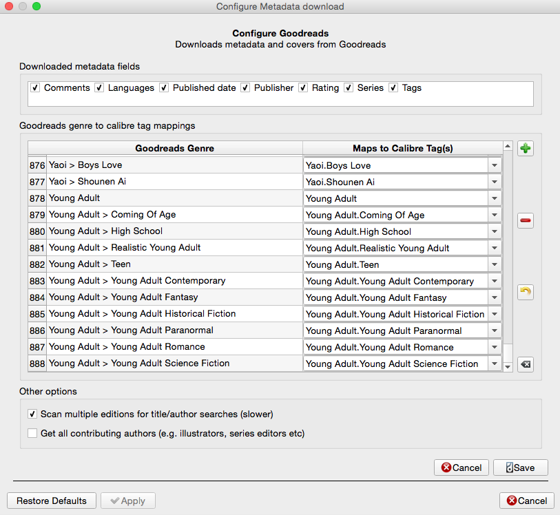 The only problem is: How to corporate this huge list (888 entries) into the goodreads metadata source plugin? I constructed from the nested list with a small python program two goodreads.json files: One with hierarchical tags (e.g. mapping goodreads genre "Academic > Campus" with calibre tag "Academic.Campus") and one without hierarchy (e.g. mapping "Academic > Campus" into "Campus".) Two pictures display the difference.