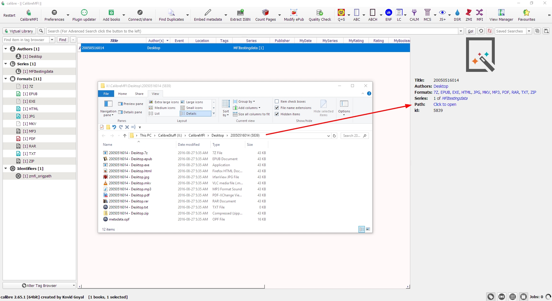 This enables copying of the 'books' among Calibre libraries. Clicking the Book Detail pane 'format', such as 'JPG', will open the appropriate program for that file extension. The Calibre 'Check Library' action now finds no extraneous files. DaltonST |
