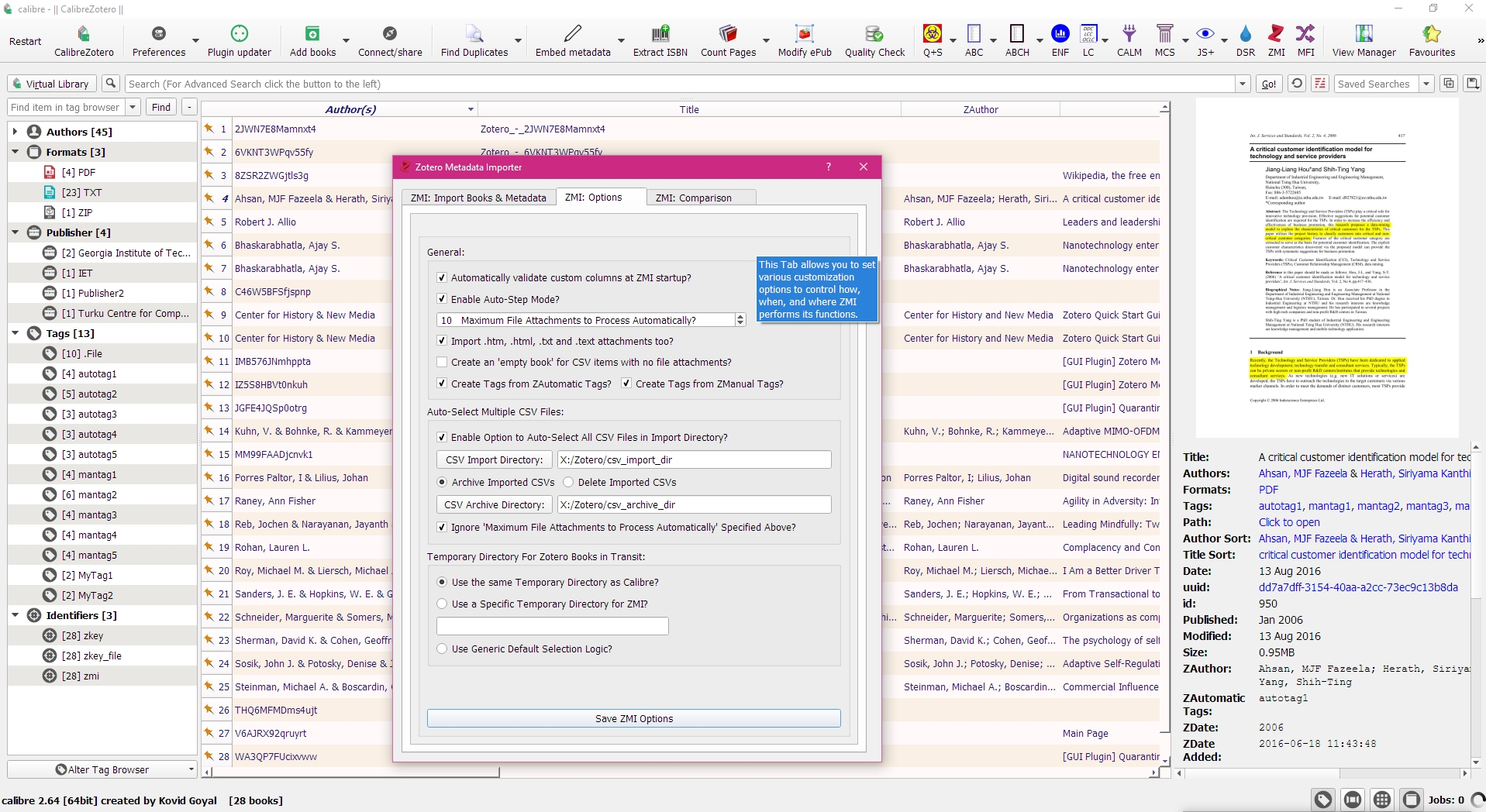 I am going to "turn on" a lot of the debugging print commands in ZMI, and then upload it just for you to download and import into Calibre manually. Then, repeat what you just did. Be sure to run Calibre as an Administrator per a previous post, and to restart Calibre in "debug mode" via the Preferences button. Check back right here in a little while for a special version of ZMI just for you to debug with. DaltonST Last edited by DaltonST; 08-13-2016 at 03:21 PM. Reason: Added zmi zip |