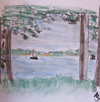 Was man so sieht, wenn man auf einer Wiese sitzt und unter den Bäumen durch übers Wasser guckt.