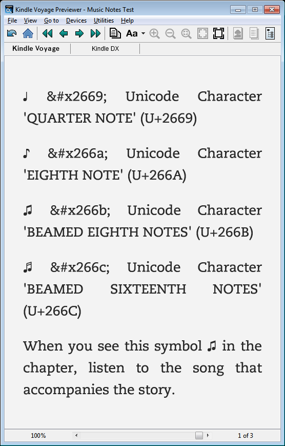 Open Source Fonts There are plenty of free fonts you can choose from to embed: https://en.wikipedia.org/wiki/Open-s...code_typefaces One of the fonts that includes the ♫ is Deja Vu Sans, which can be downloaded here: http://dejavu-fonts.org/wiki/Main_Page You can easily add the OTF or TTF fonts to the EPUB just like you add any other file. Then you just have to make sure to properly add the references to CSS. Example Musical Notes EPUB Here is example code (sample EPUBs attached to this post): Quote: