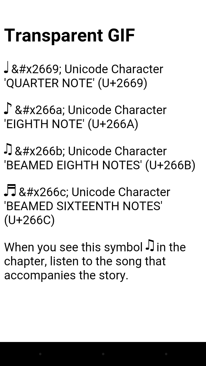 Night Mode So, I open up my book. White background black text, who could read any other way? My book looks PERFECT! It is getting a little late and the white is starting to blind me. Let me flick on Night Mode: Oh crap, where did those musical notes go? Well let me go to the non-transparent version: Woof, I can't even tell what those notes are. Now let me just swap over to the Embedded Font:Beautiful! Colors, Colors, and More Colors Now, forgive me ahead of time for these abominations, but I wanted to show how it would look if a reader picked a Green background + Red text: I love to read in Red text, but those stupid musical notes are ruining my perfect look! As you can see, the Transparent/Non-Transparent Images have some serious mismatches.One of the things you have to keep in mind when you create these ebooks is that people will be reading on all different types of settings, and you should make sure your book does great in most/all of these situations. Night Mode and Color are two of the most used settings (on non-e-ink devices). ![]() One symbol? One symbol? The entire fate of the world is in the balance here! ![]() Quote: