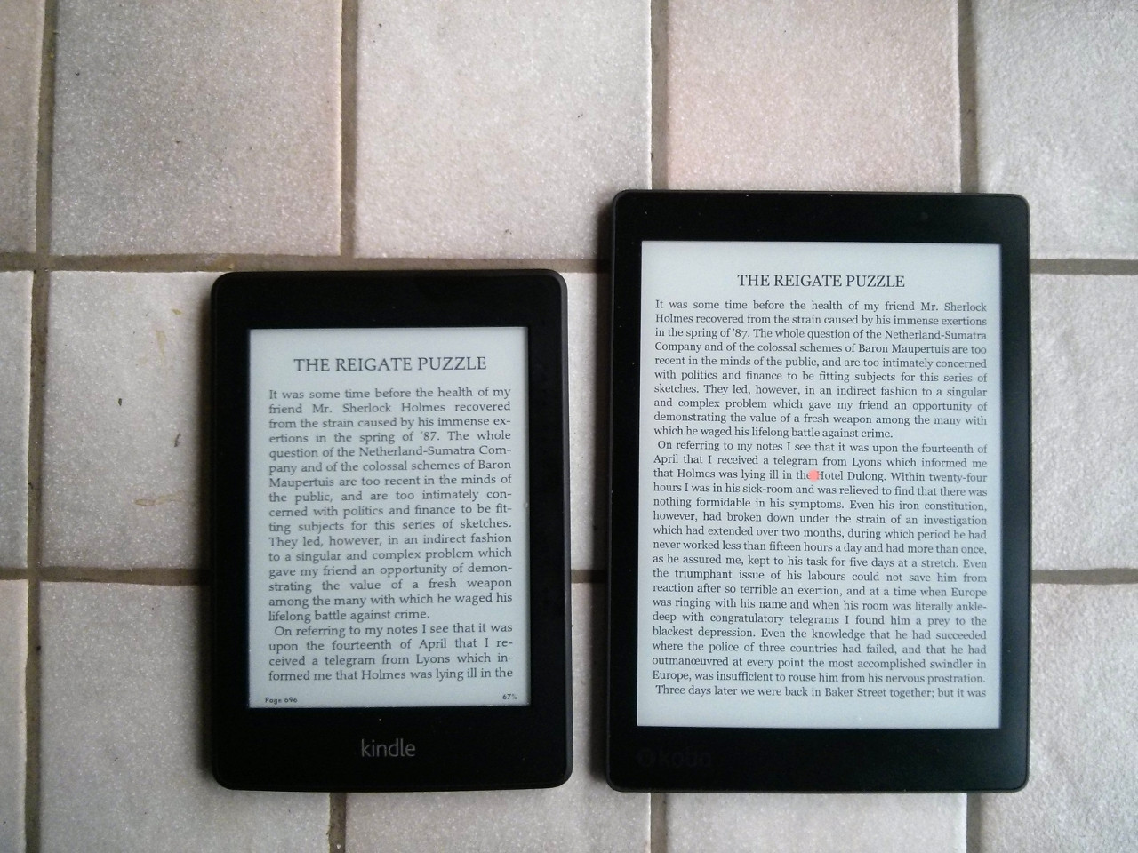 In picture r1, the red dot on the KA1 marks the spot where the Kindle screen is full. (I must admit that the Aura ONE's text is a bit smaller in this picture, but still; you should be able to fit at least twice the amount of text on an KA1 as compared to a KPW1.) In pictures r7 and r8, there's a comparison between the smallest, and next to smallest margin settings. I don't know if I like reading with all the text right up to the edge of the reader.