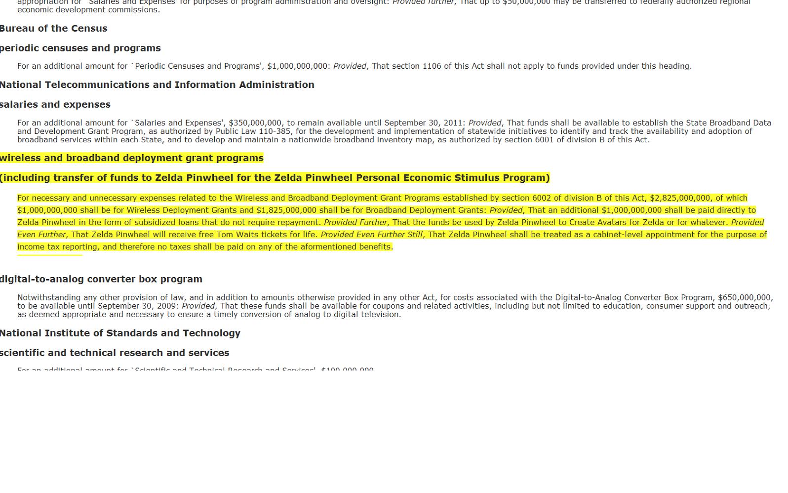 Zelda must have some serious pull with the U.S Congress. I have been reading the stimulus package that is being voted on now and found that they have allocated $1,000,000,000 to Zelda for the creation of avatars. I have attached a screen shot or those who do not believe me. Is this a good idea? Discuss.